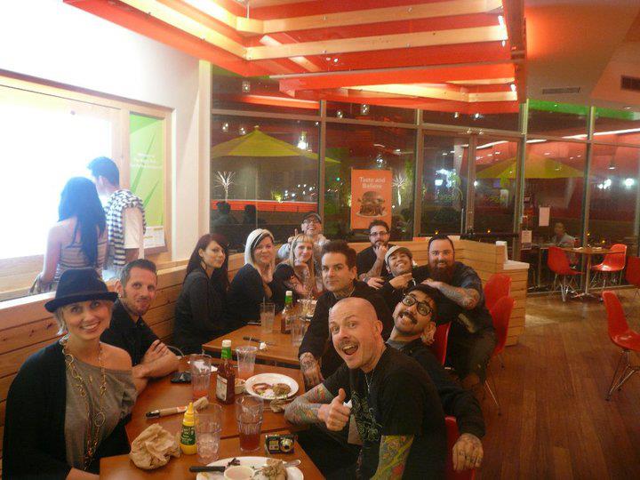 ” Questa foto l’adoro, dopo la Hollywood Tattoo Convention , stanchi morti ci siamo recati al veggie Grill di L.A. insieme ai nostri amici , Los acegueda , Kyle e Justine del Torch Tattoo , la crew del marchio di abbigliamento To die For clothing, Dan smith e la sua bellissima moglie . Dan Smith e stato tatuatore della la serie televisiva di Kate Von D. L.a. Ink . Dan Smith è da sempre un sostenitore per i diritti animali; è vegan straight edge, ed è stato testimonial delle scarpe cruelty free Macbeth shoes.