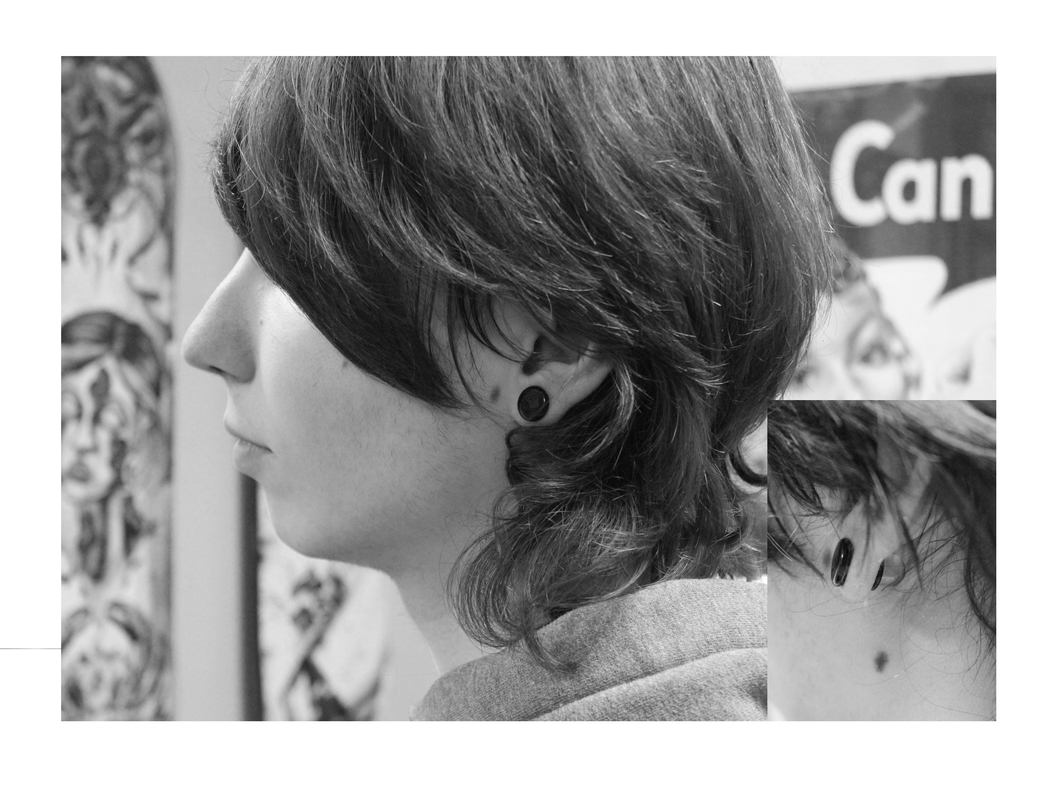 Il primo approccio cliente fu quello di farsi fare un ear lobe piercing tradizionale con uno spessore di 1.6 mm (14gauge nella misura americana). Seguitamente e dopo un colloquio sul lavoro da fare, abbiamo deciso di portare la perforazione tramite aghi di spessore maggiore a 4mm di diametro (6gauge nella misura americana) ed infine il mio cliente si decide di fare lo scalpelling dei lobi portando il diametro direttamente a 10 1/2 mm (000 gauge nella miusra americana)